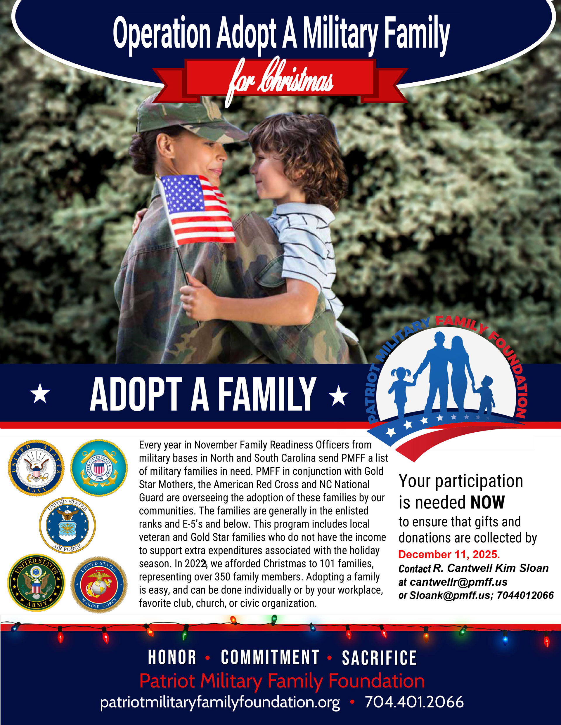 November of each year Family Readiness Officers from military organizations in North and South Carolina send the Patriot Military Family Foundation (PMFF) a list of military families in need.  PMFF, in conjunction with Gold Star Mothers, the American Red Cross and the National Guard, oversee the adoption of these families by our donor communities.  The families are generally in the enlisted ranks and E-5’s and below.  This program includes local veteran and Gold Star families who do not have the income to support extra expenditures associated with the holiday season.